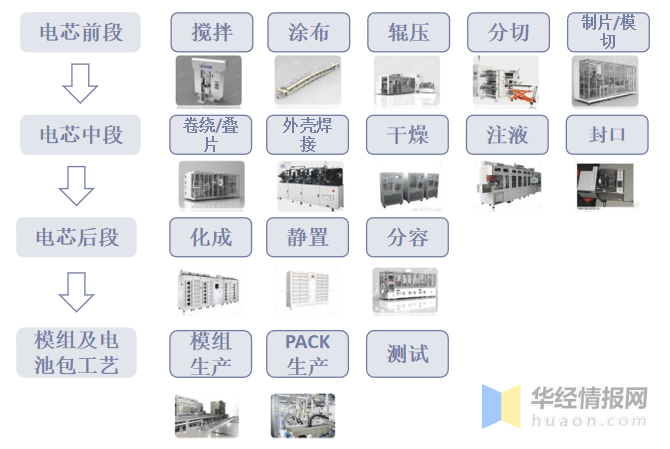 鋰電設備指用于生產鋰電池的各類設備,鋰電設備和鋰電池生產工藝一一對應。鋰電池生產工藝包括電芯前段工藝(極片制作)、電芯中段工藝(電芯制作)、電芯后段工藝(化成分容),以及模組和電池包(PACK)工藝,對應的鋰電設備分為前段設備、中段設備、后段設備、PACK設備等。