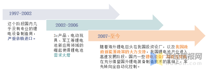 國內鋰電池設備行業的發展大致經歷了以下三個階段,1997-2002年是我國鋰電池試生產和小規模化生產裝備研究、制造階段。2002-2007年是我國鋰電池規模化生產裝備研究、制造階段。隨著各類新型電子產品的快速普及,國內鋰電池產業獲得了迅猛發展,電池裝備制造業也隨之發展壯大2007年以來我國鋰電池裝備國產化進程加速、向國際水平發展階段。國內鋰電池產業在政府的新能源政策支持下也進入快速發展的新階段。