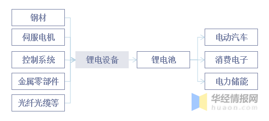 鋰電設備上游包括鋼材、電機、控制系統、氣缸、軸承、光纖器材等原材料和零部件。下游包括新能源汽車、消費電子、電力儲能等領域使用的鋰電池。