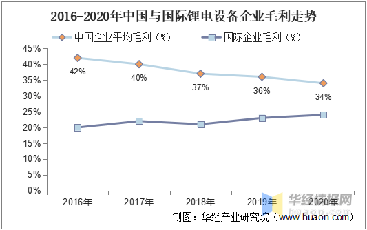 2016-2020年中國與國際鋰電設備企業毛利走勢