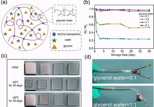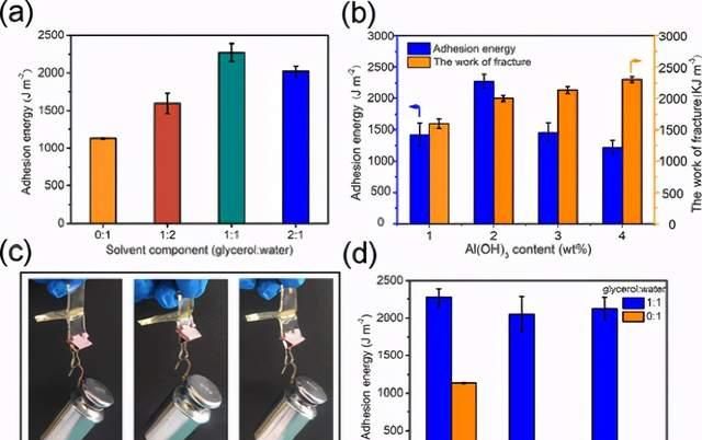 具有強(qiáng)濕粘附力的堅(jiān)韌水凝膠已在各種應(yīng)用中引起廣泛關(guān)注。然而,在水凝膠中實(shí)現(xiàn)優(yōu)異的濕粘合性和耐凍干性仍是挑戰(zhàn)。最近,北京理工大學(xué)李歡軍副教授團(tuán)隊(duì)在Al(OH)3納米粒子作為交聯(lián)劑的情況下,基于甘油-水二元溶劑系統(tǒng),提出了堅(jiān)韌的透明納米復(fù)合有機(jī)水凝膠。