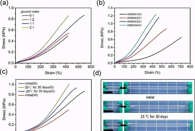 圖2.(a)具有不同甘油含量的AM90Al2G凝膠的拉伸應(yīng)力-應(yīng)變曲線。(b)具有不同Al(OH)3含量的AM90AlG1凝膠的拉伸應(yīng)力-應(yīng)變曲線。(c)初始和預(yù)處理的AM90Al2G1凝膠和初始AM90Al2W凝膠的拉伸應(yīng)力-應(yīng)變曲線。(d)展示AM90Al2G1凝膠在25或-20°C儲(chǔ)存30天之前和之后顯著拉伸變形的照片(比例尺:1 cm)。