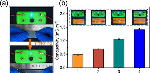 圖3.(a)使用AM90Al2G1凝膠作為導(dǎo)體進(jìn)行拉伸前后(長度:3厘米,寬度:2厘米),LED燈泡亮度(工作電壓,4.5 V)的比較。(b)導(dǎo)電性對(duì)Al-NC-G凝膠中各種Al(OH)3含量的依賴性以及顯示LED燈泡亮度變化的相應(yīng)照片。
