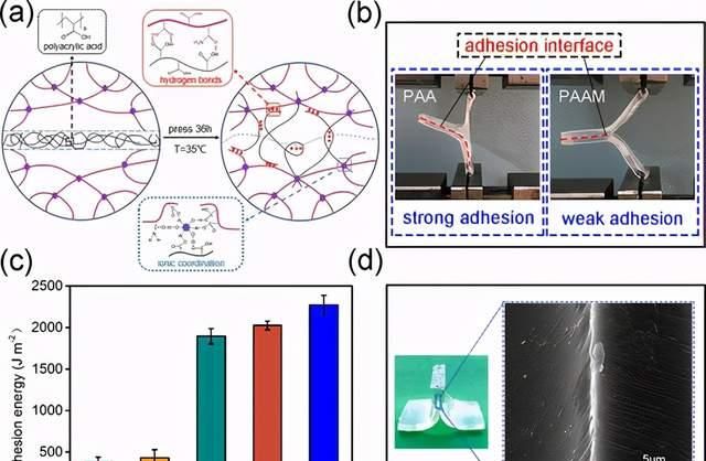 圖4.(a)Al(OH)3 NC有機(jī)水凝膠(Al-NC-G凝膠)的粘附原理示意圖。(b)根據(jù)T型剝離粘合力測(cè)試顯示強(qiáng)粘合力(PAA)和弱粘合力(PAAM)的照片。(c)各種橋聯(lián)聚合物對(duì)Al-NC-G凝膠粘附能的影響。(d)兩個(gè)Al-NC-G凝膠表面之間的濕粘附界面的SEM圖像。
