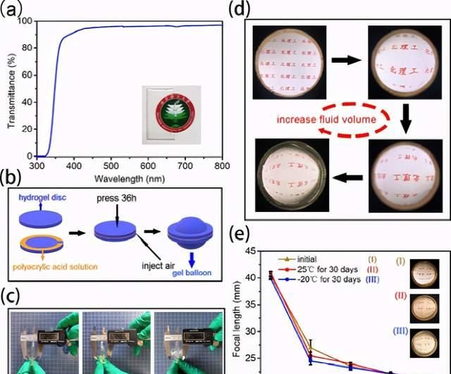 圖6.(a)AM90Al2G1凝膠的透射率。(b)AM90Al2G1凝膠透鏡的制備示意圖。(c)顯示AM90Al2G1凝膠氣球的密封性能的照片。(d)AM90Al2G1凝膠透鏡中的液體含量對(duì)圖像狀態(tài)的影響。水凝膠透鏡與物體之間的距離固定為60mm,并且透鏡的內(nèi)徑為30mm。(e)在不同條件下的AM90Al2G1凝膠透鏡的焦距與所填充液體含量的照片以及它們之間的關(guān)系。(I)首字母;(II)在25°C下保存30天;(III)在-20℃下保存30天。