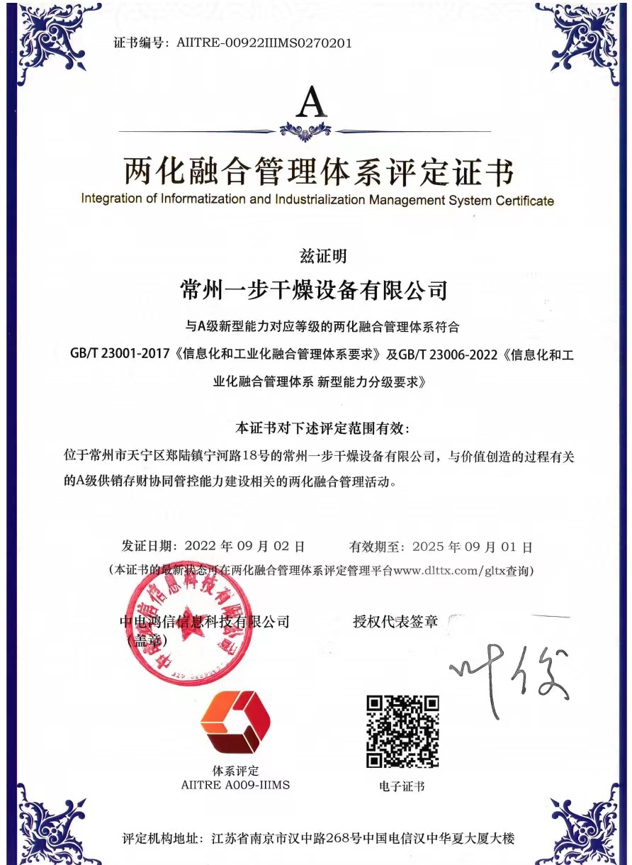 2022年9月2日,常州一步干燥設備有限公司成功獲得《兩化融合管理體系評定證書》,這標志著我司在推進工業化和信息化融合方面取得了新的突破。兩化融合管理體系認證的獲得,推動了企業管理革新、流程優化、技術創新和數據開發利用工作?!?