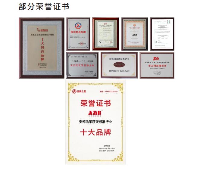 安邦信?成?以來,?直注重技術創(chuàng)新 和產(chǎn)品質量,歷經(jīng)20余年的發(fā)展,安邦信成 為“國家級?新技術企業(yè)”,并獲得了政府 部 ? 及 客 ? 的 信 賴 , 2004年 , 通 過 德 國 TUV機構ISO9000質量體系認證;2006年, 被深圳市政府評為“軟件技術企業(yè)”; 2008年,AMB-HVI?壓變頻器被評為“廣東 省重點新產(chǎn)品”;2009年,被授予“國家級?新技術企業(yè)”、“寶安?營企業(yè)100強”、“國內通?品牌”、“中國變頻器?? 滿意??國內品牌”;2010年,通過ISO9001質量認證體系,獲得“深圳市知名品牌”、“?東省著名商標”稱號;2011年7 ?,被國家發(fā)改委、財政部授予節(jié)能服務公司資質(EMC服務公司);2013年,獲得“2013中國變頻器??知名品牌”;2016 年,獲得“深圳市知名品牌”、“?東省著名商標”稱號;2020年,獲得“中國電?節(jié)能30年杰出貢獻企業(yè)”。
