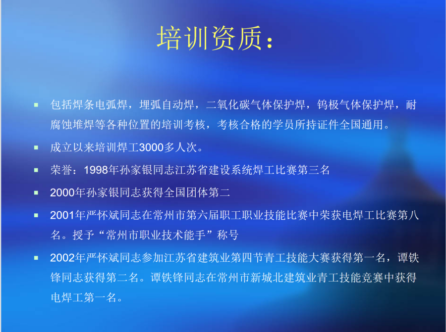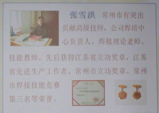 張雪洪:常州市特種設備焊工培訓中心,焊工考試機構主任, 常州市有突出貢獻高級技師,公司焊培中心負責人,焊接理論老師、技能教師,先后獲得江蘇省立功獎章,江蘇省先進生產工作者、常州市立功獎章、常州市焊接技能競賽第三名等榮譽